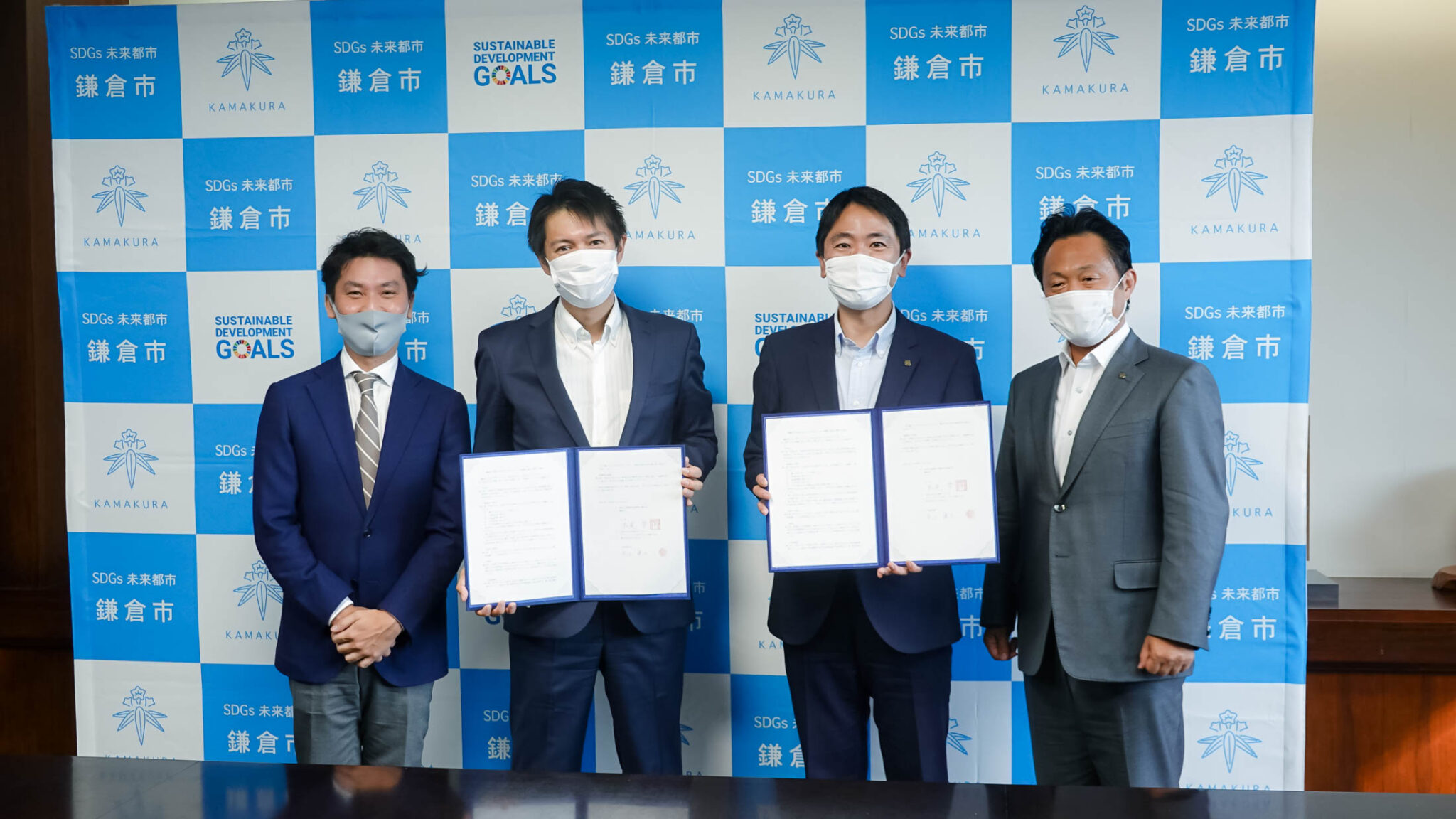 (左から株式会社Public dots & Company 代表取締役 伊藤大貴/株式会社FunMake代表取締役 市位謙太/鎌倉市市長 松尾崇/鎌倉市副市長 千田勝一郎)