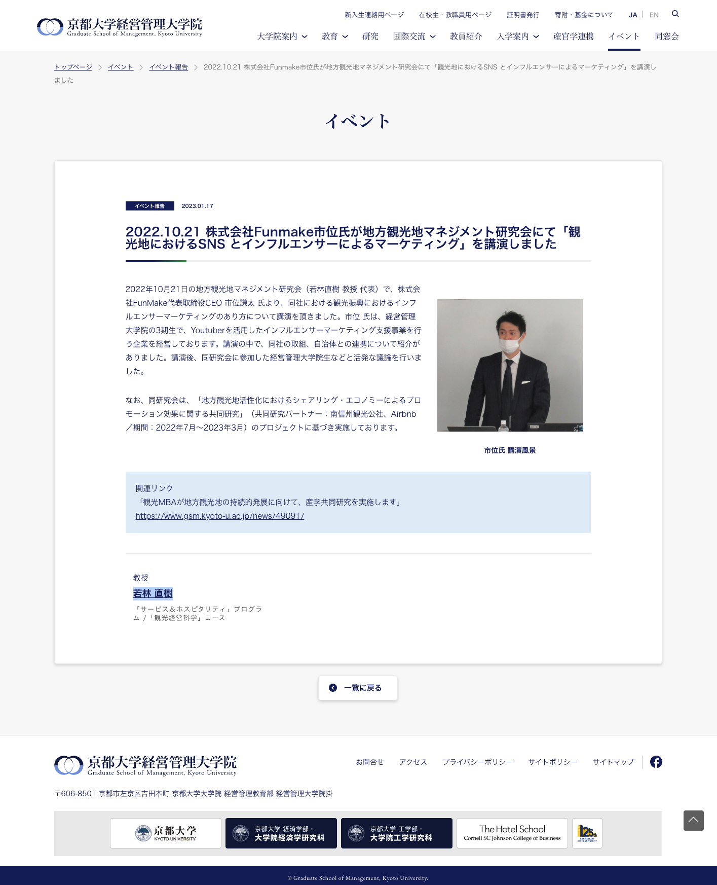 関連リンク 「株式会社Funmake市位氏が地方観光地マネジメント研究会にて「観光地におけるSNS とインフルエンサーによるマーケティング」を講演しました」 https://www.gsm.kyoto-u.ac.jp/news/49091/