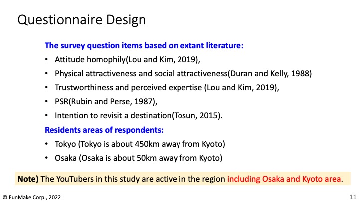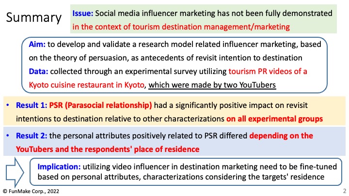 株式会社FunMake(ファンメイク、本社:大阪市北区、代表取締役:市位 謙太、以下「FunMake」)は、代表取締役の市位謙太および弊社顧問の増田央(京都外国語大学)が、AHFE2022国際学会(2022年7月24〜28日・シェラトンニューヨークタイムズスクエア、アメリカ)にて「Influencer attributes and characterizations on Tourists' intention to revisit destination in social media influencer marketing」の学会発表を行ったことをご報告いたします。