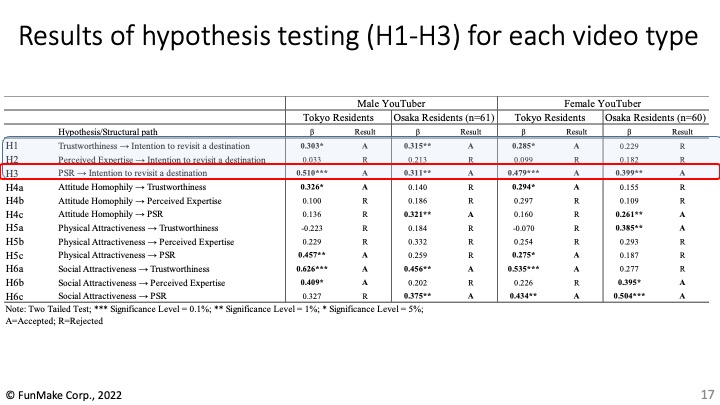 再訪問意向にはPSR(パラソーシャル・リレーションシップ/疑似的な人間関係)が特に重要であること、そしてYouTuberと視聴者との間に形成されているPSRは東京と大阪では異なるという結果となりました。