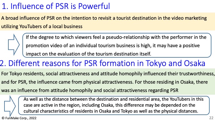 YouTuber等のインフルエンサーを起用する観光ビデオマーケティング戦略では、PSRが非常に重要な指標であることと同時に、インフルエンサーの個人的な属性およびターゲットの居住地を考慮しつつ微調整する必要があることがわかりました。