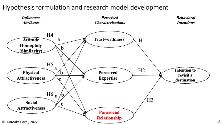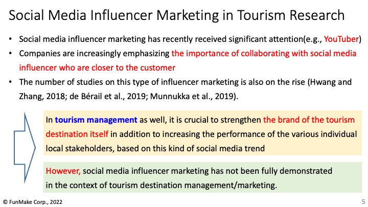 今回はYouTuberを起用したインフルエンサーマーケティングを実施する上で、観光客の目的地への再訪問意向にインフルエンサーの属性と特性がどのように関係するかの研究を行いました。