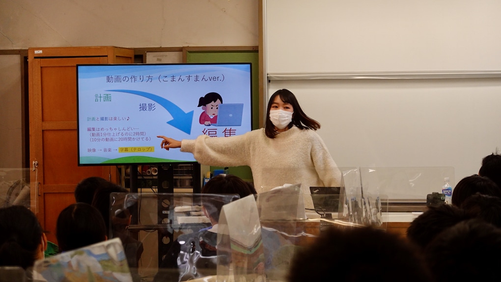 浜脇中学校の2年生に向けて、現役大学生クリエイターである「こまんすまん」が比較的近い立場から、YouTuberになったきっかけや、YouTuberとしての活動の面白さや難しさ、良い動画を作る心構えといったことについて話をしました。学生からも意欲的な質問が多く飛び出し、活況な講座となりました。
